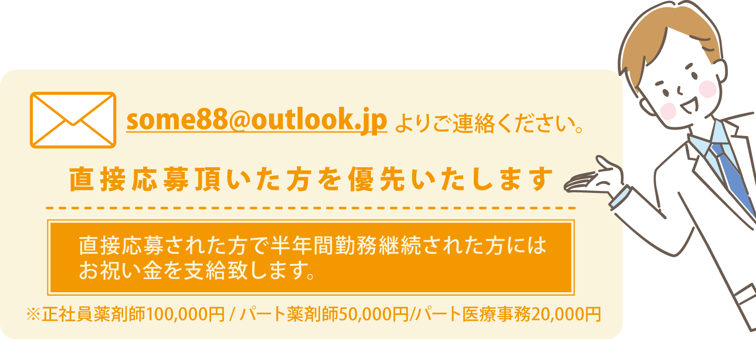 ※正社員薬剤師100,000円 / パート薬剤師50,000円/パート医療事務20,000円